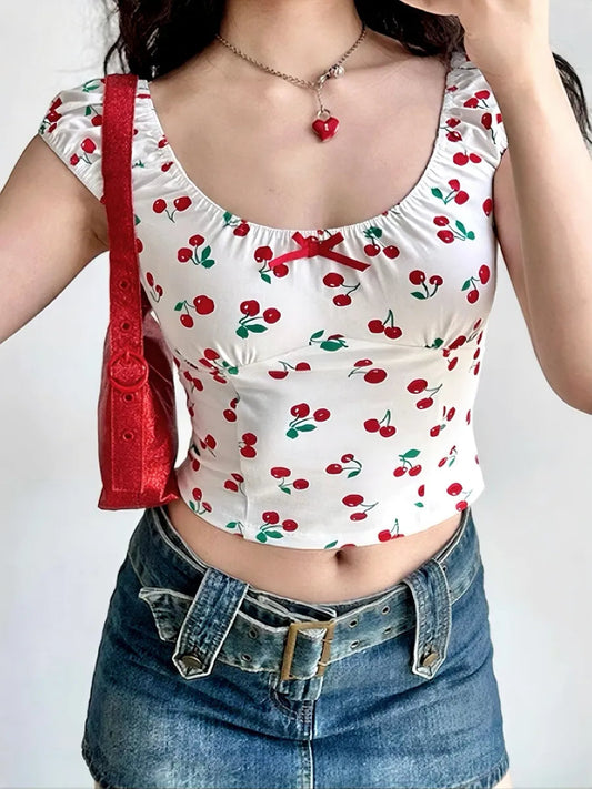 'Cherry Pie' Coquette Girl Cherry Crop Print Top