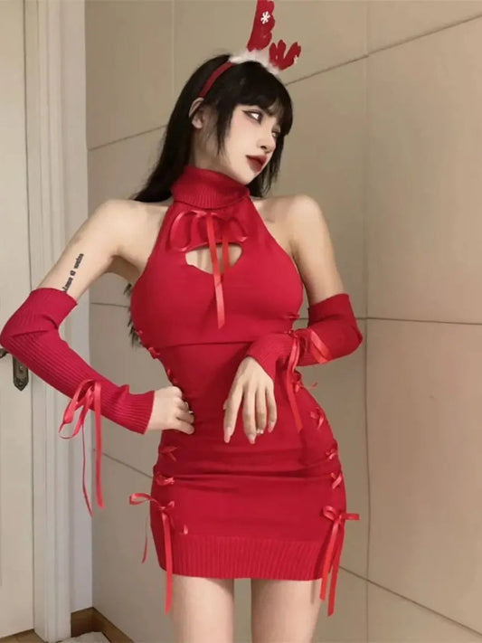 'Praise' Turtleneck Ribbon Knitted Dress