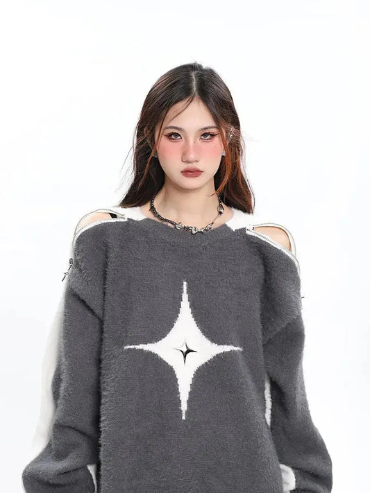 'Polaris' Star Hollow Out Zip Up Sweater