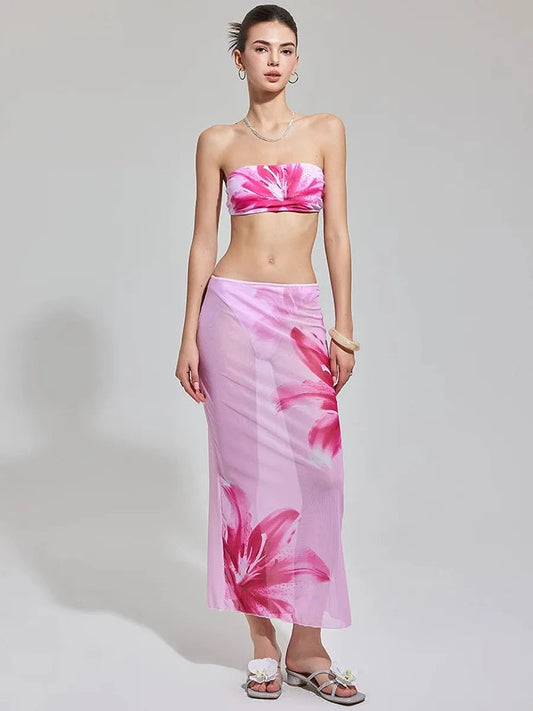 'Petal Potion‘ Y2k Pink Summer Beach Core Flower Bikini Set With Midi Skirt