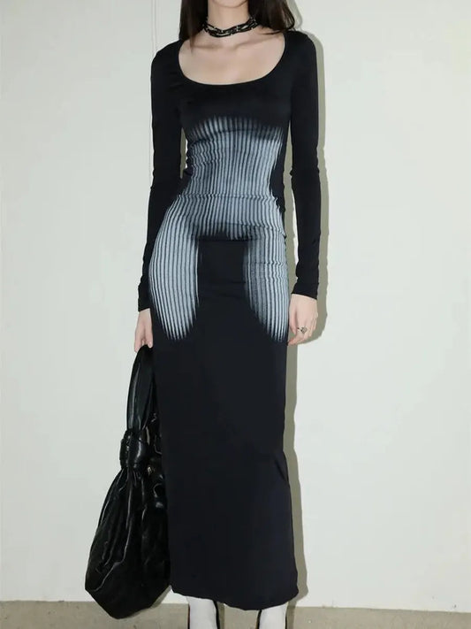 'Body Tea' Dark Sculpture Long Midi Black Sheath Dress