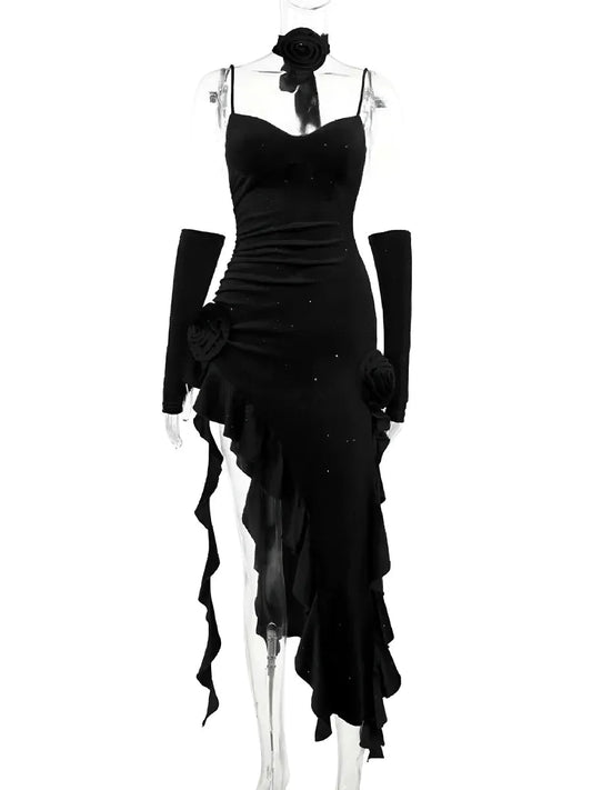 'Supernova' Black Lace Up Irregular Cami Midi Dress