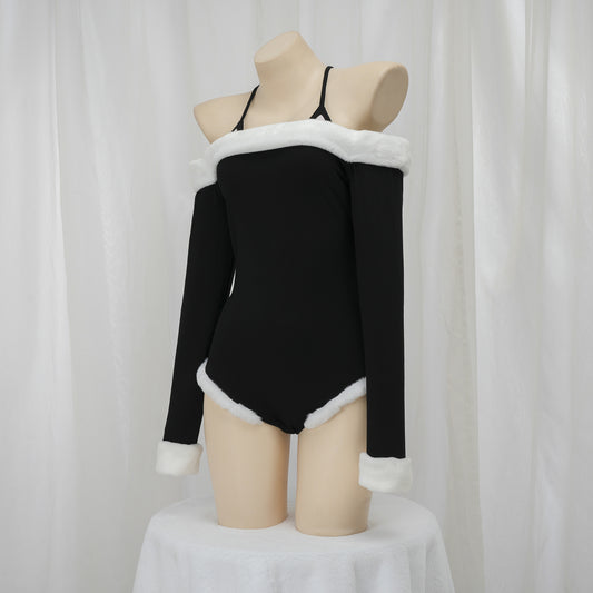 'Monochrome Temptation' Off-Shoulder Fuzzy-Trim Sexy Bodysuit