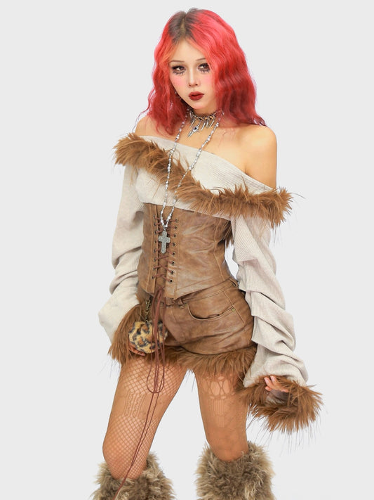 ’Wild Heart' Y2K Faux Fur Off-Shoulder Long Sleeve Top + Shorts Set