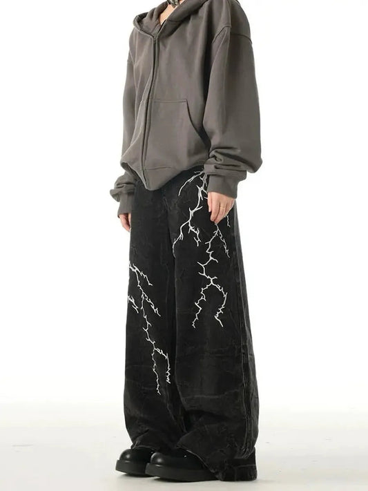 ’Lightening' Thunder Pattern Oversized Cargo Denim Pants
