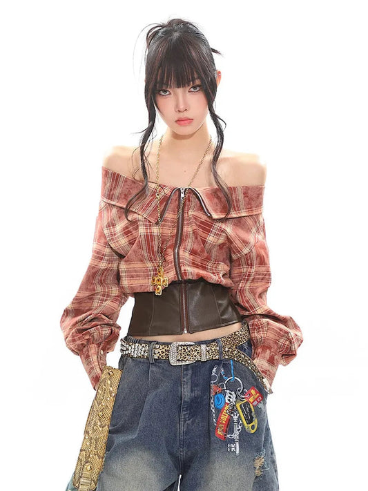 'Ruby Chocolate' Y2k Off-Shoulder Zip Checkerboard Jacket