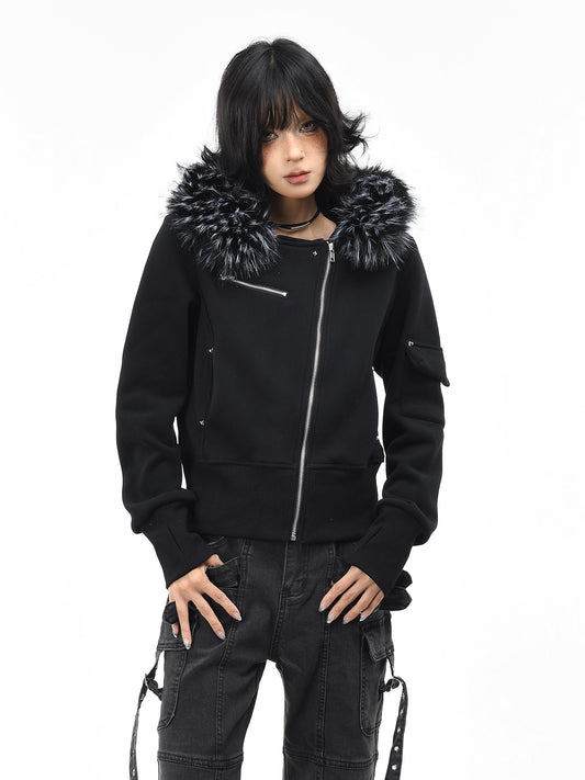 'Dark Crest' Faux Fur Collar Asymmetrical Hoodie Jacket