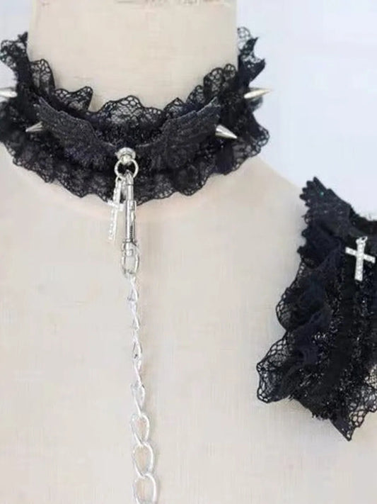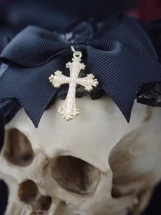 [Brenda] Lace Bowknot Cross Pendants Choker