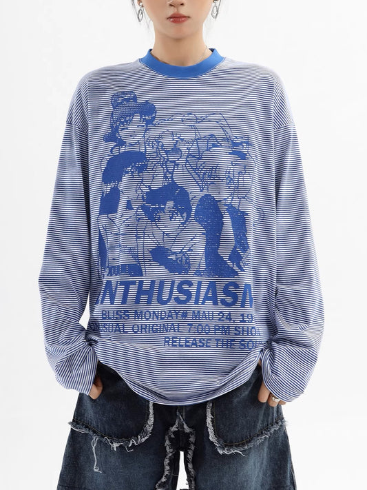 'Cartoon Otaku' Vintage Anime Character Printed Striped Long-Sleeve Top
