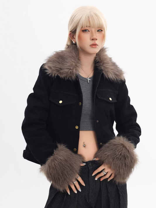 'Blue Haven' Vintage Fur-Collar Cropped Denim Puffer Jacket