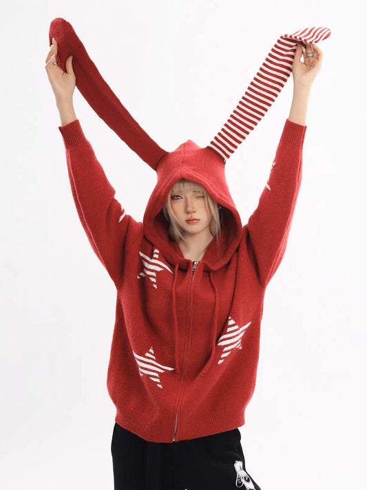 'Astro Bunny' Star Hooded Bunny-Ear Zip-Up Knit Cardigan