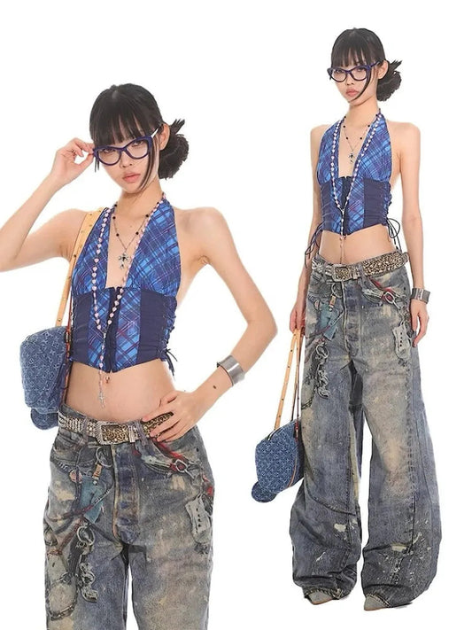 'Blue Blood' Y2k Checkerboard Halter Neck Top