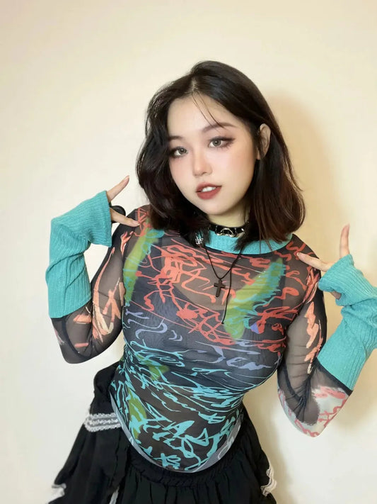 'Windy Summer' Y2k Patchwork Sleeves Graffiti Mesh Top