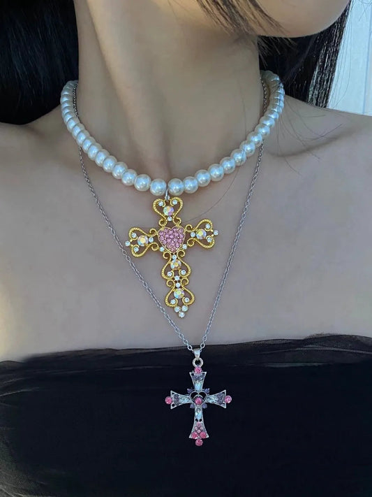 'Gloria' Y2k Goth Rhinestone Heart Shape Cross Beads Necklace