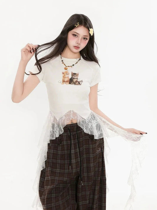 'Layka' Streetstyle Kitty Face Lace Pattern Shirts