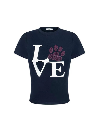 Puppy Paw Love Shirt features a charming dog paw design adorned with sparkling rhinestones. Its flattering fit makes it a stylish addition to any wardrobe.