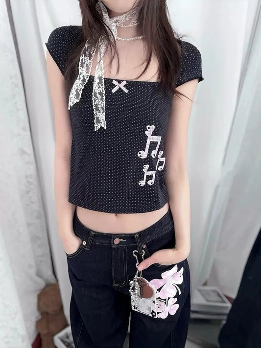 'The Note' Coquette Retro Note Pattern Shirts Polka Dots Top