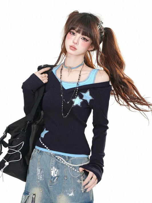 'Born Star' Blokette Star Y2k Patchwork Long Sleeve Slim Shirts