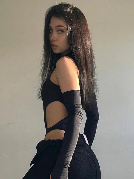'Sheesh' Technical Cutout Black Bodysuit Top