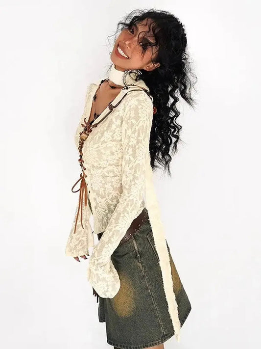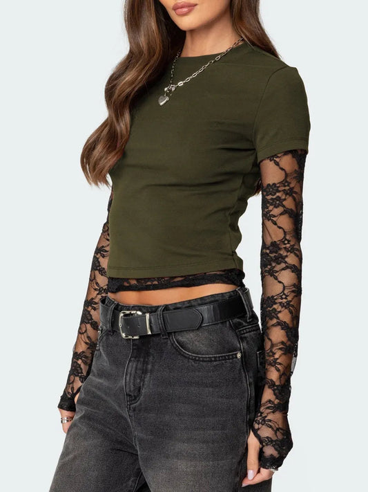 'Endless Night' Y2k Lace See Through Patchwork Long Sleeve Shirts
