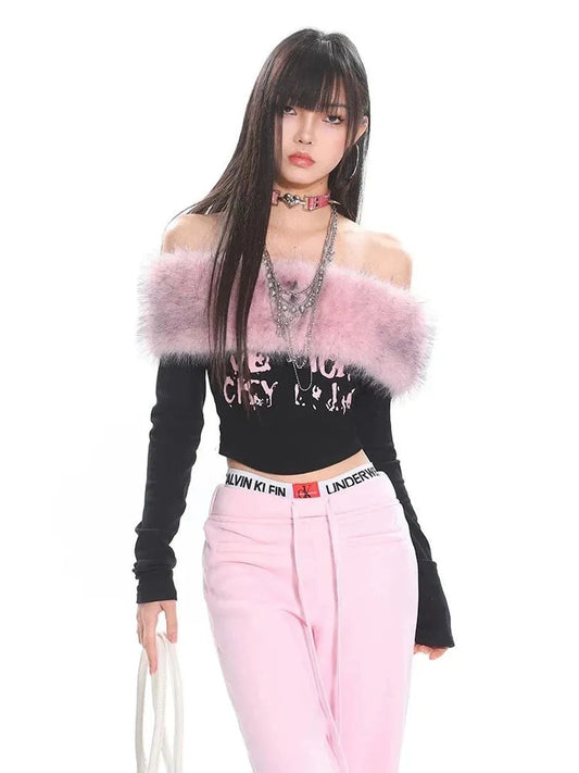 ’Love Chip‘ Y2k Pink Off Shoulder Fluffy Top