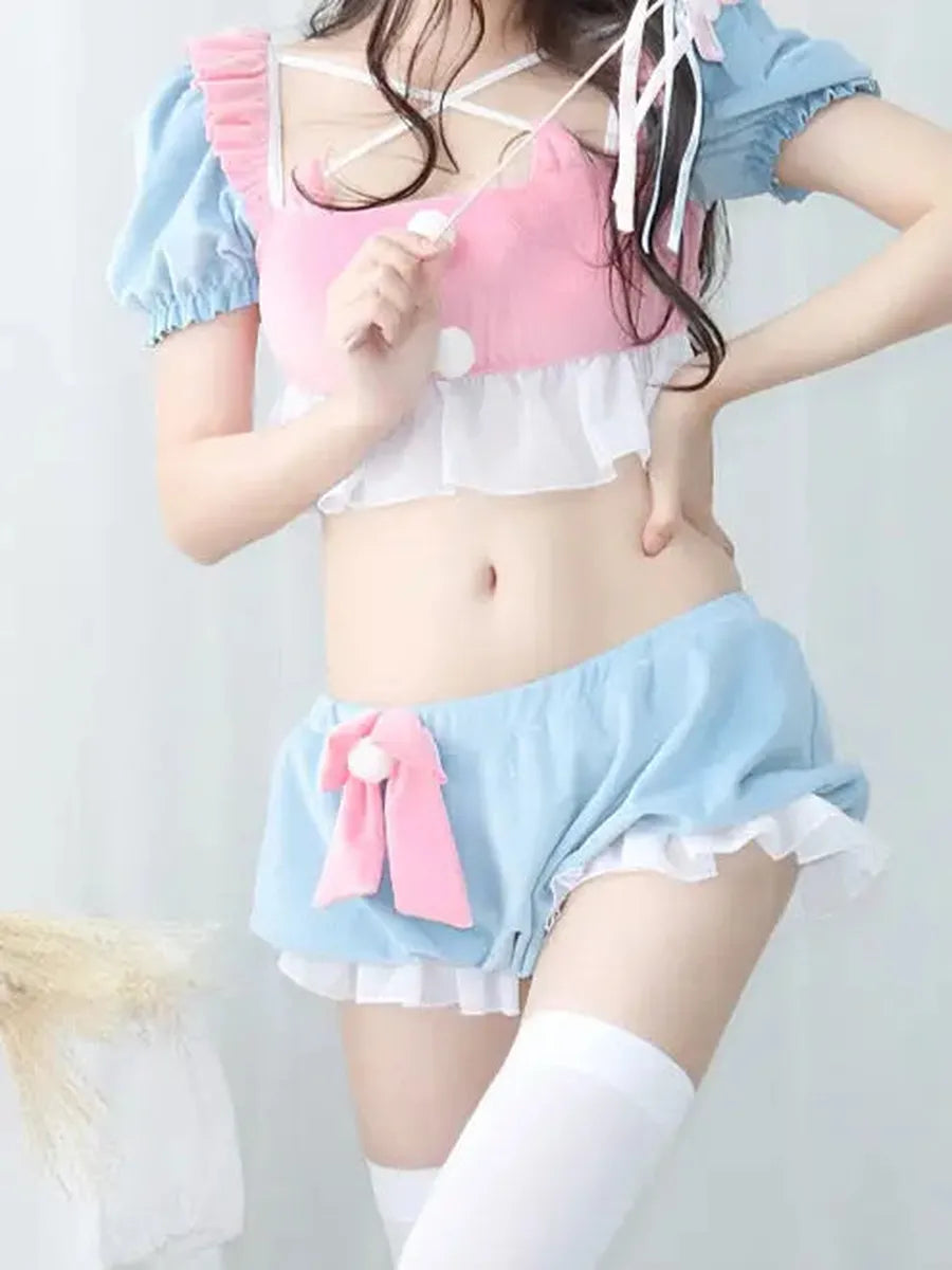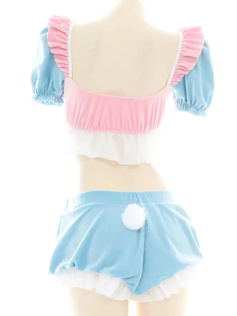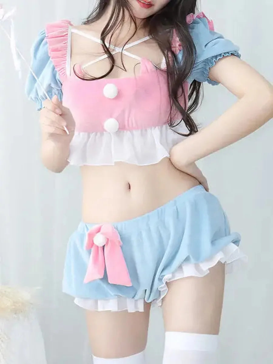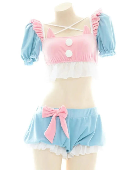 This kawaii ‘Melody’ homeware set is the perfect comfy costume for any anime-loving girl. The pink crop top and baby blue shorts feature an adorable anime-inspired print of the character ‘Melody’—a sweet, pink-haired magical girl with a microphone and musical notes.