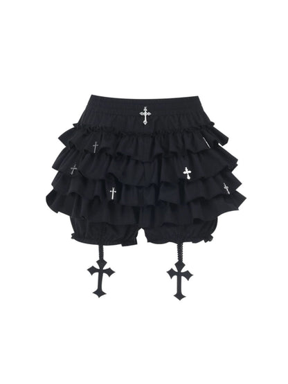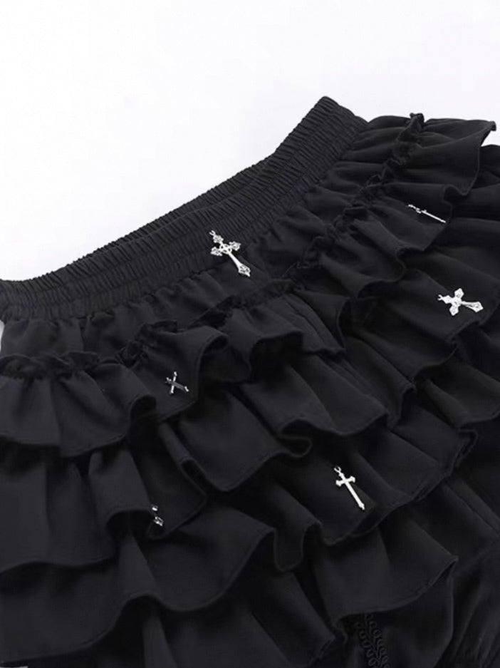 Made with a soft, comfortable material, these edgy shorts feature ruffle details and a stylish cross pendant. Perfect for adding a touch of cute and rebellious style to your wardrobe.